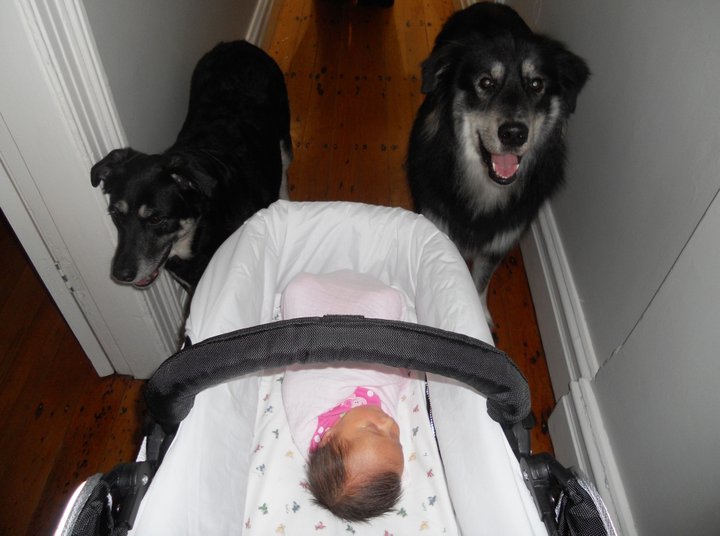 Bella and Bear instantly took Bubba in as one of our pack. They are full of curiosity for this small person and show great concern when she cries. Particularly if I take more than 10 seconds to respond – then I get the look, or the nudge!