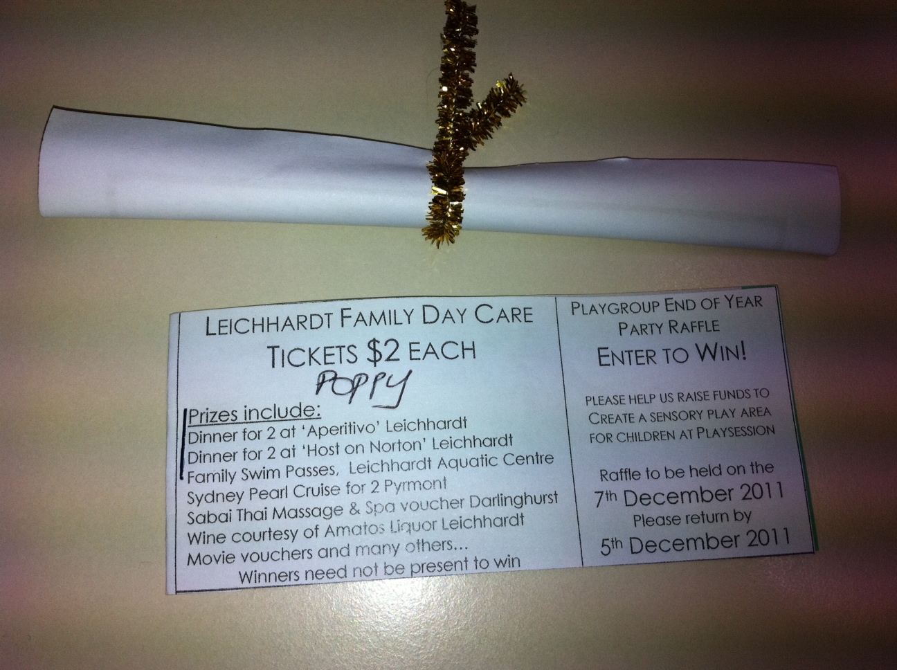 I didn’t expect to have her first raffle tickets arrive before her first birthday, but they did. There are 10 raffle tickets – the prizes are all for local businesses, and the raffle book has Bubba’s name on the front of it. And it came with an invitation to the Family Day Care Playgroup’s Christmas Party. Awwww.