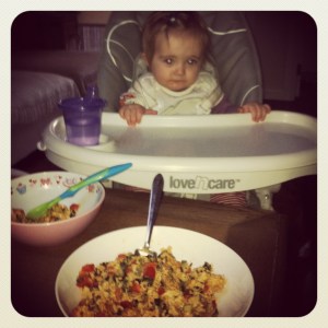 Last night we had delicious farm fresh scrambled eggs (with golden yellow yolks from very happy hens) with loads of organic vegetables. I wonder how many other bubbas happily ate kale, zucchini, capsicum, tomatoes, basil, sweet potato, eggplant – and a little mozzarella thrown in for good measure – last night?