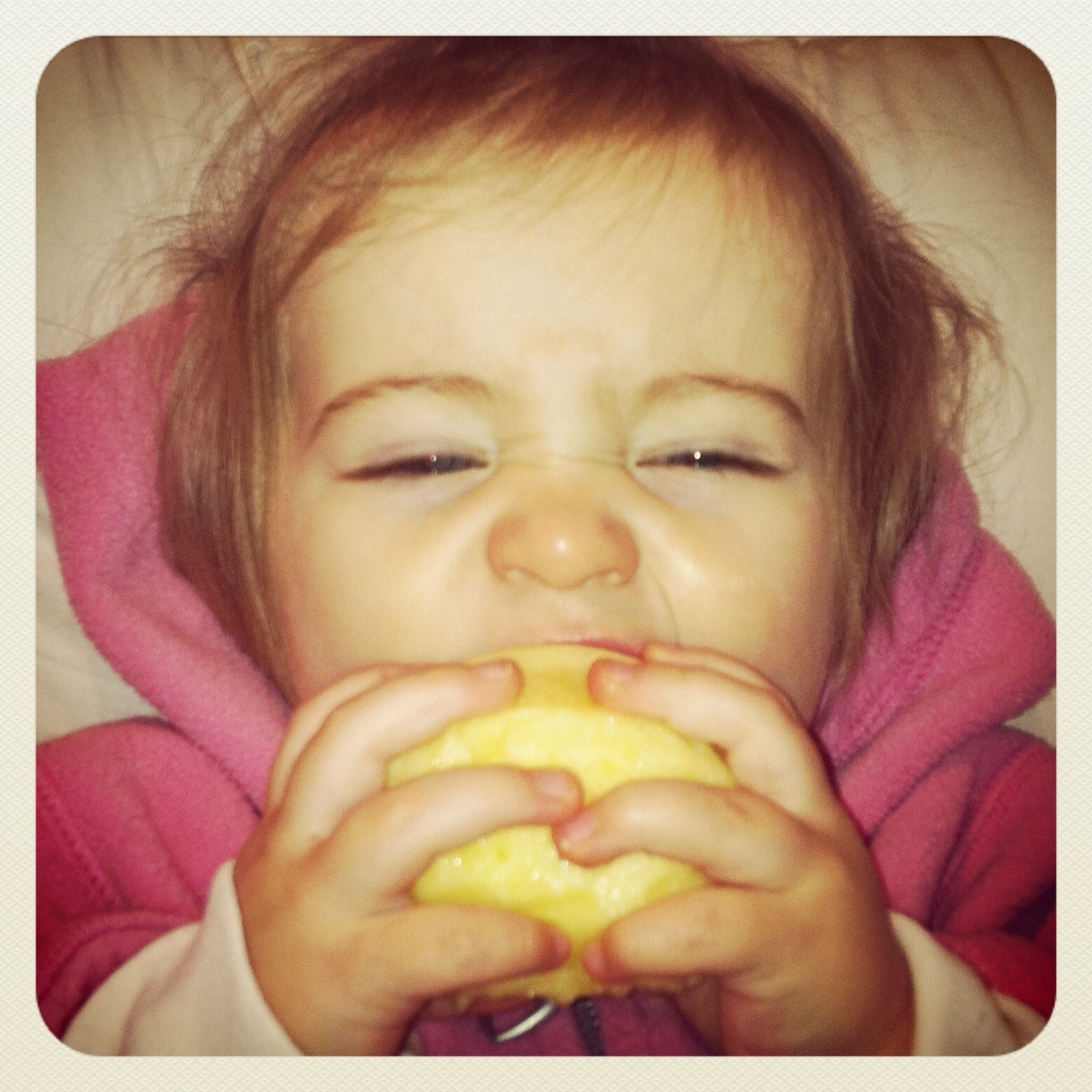 We were doing our smell and texture exploration at the fruit bowl and when I handed her an apple she went to take a bite of it. Holding the core in one hand and the base of the apple in the other hand. As she put her mouth against it she screwed up her nose and handed me the apple. My attempt to put it back in the fruit bowl was met with shaking of her head, so I sat her down, peeled the apple and handed it back to her whole.
