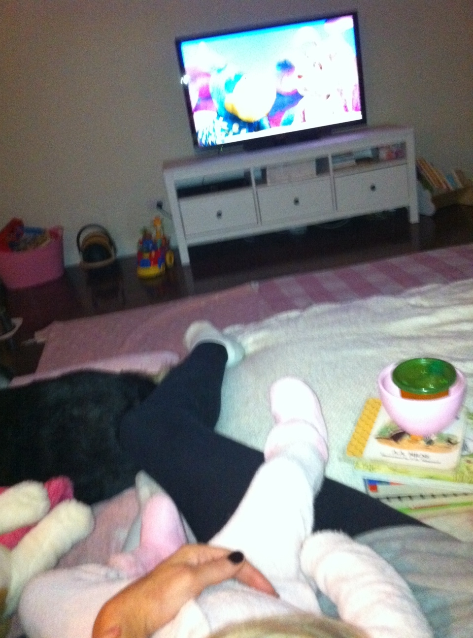 Bubba and I were on the couch a couple of nights ago (before the germs got their eviction notice) and Bubba wasn’t feeling very well. So, we two and our furry loves were all snuggled up watching The Pajanimals.