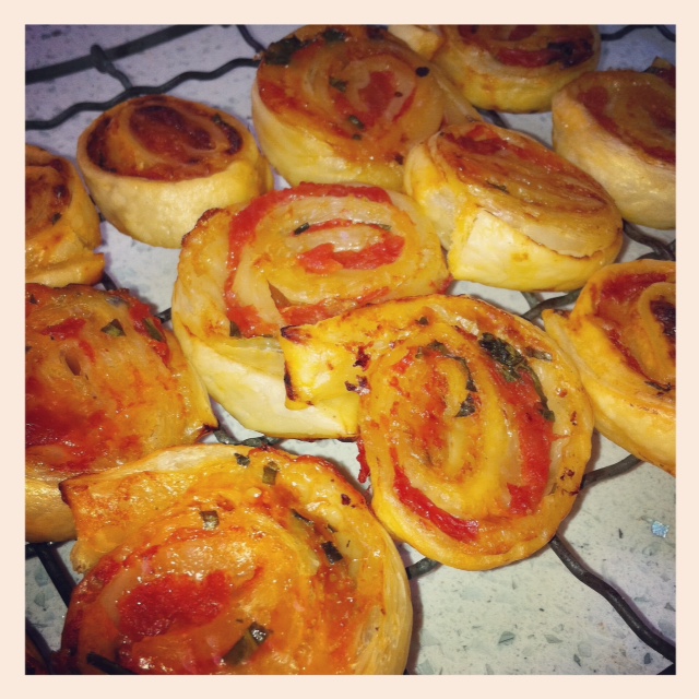 On a sheet of pastry (today I used store-bought gluten-free – but if you have the time you can make your own) I spread a dessert spoon of organic tomato paste, a couple of leaves of shredded basil, 1/3 tin of organic diced tomatoes (which I drained) and a good shaving of cheese. I used a combination of organic cheddar & and a beautiful parmesan from the Italian providore (a chunk of which would be a good snack on its own accompanied by a glass of Pinot – for mumma of course). Roll them up, cut them, lay them flat on a baking tray and bake for 15-20 mins in the oven at 160 degrees C. Melt some butter (or you can use milk) at about the 12 minute mark and brush it on so they finish nicely.