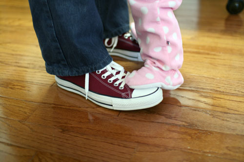 Even though she’s still really little, looking down at her I remembered standing on my daddy’s feet dancing when I was five or six, so I lifted her up and put her little feet on mine then started moving.