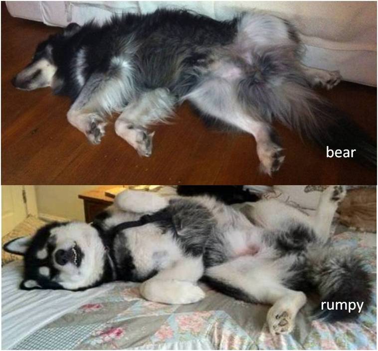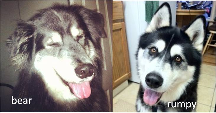 Beary and our friend Rumpy like to sleep in the same position and they have the same head tilt. Maybe that’s a Malamute trait (which Bubba has picked up!)? They’re not exactly the same, because Beary is half golden retriever … that’s why he has floppy ears.