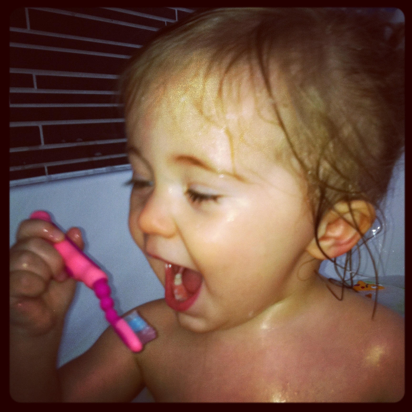 Cleaning her teeth seems to just be an extension of gnawing on toys, but she’s happy to do it so I’m happy to let her.
