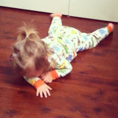 The first thirty seconds she spent running from me to the bench where the phone was just out of reach and back. Then we had the throw down. Head on right arm, left arm smacking the floor (bad floor – bad, bad floor!), screaming and sobbing. I stood near her for a minute or so then went to the other side of the room so I could be near but not right there while she rode the tantrum wave.
