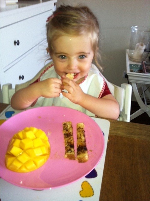 My very own happy little Vegemite, enjoying the much less salty version recently added to the market for kids. Vegemite toast soldiers and mango for breakfast – it doesn’t get much more Aussie than that!