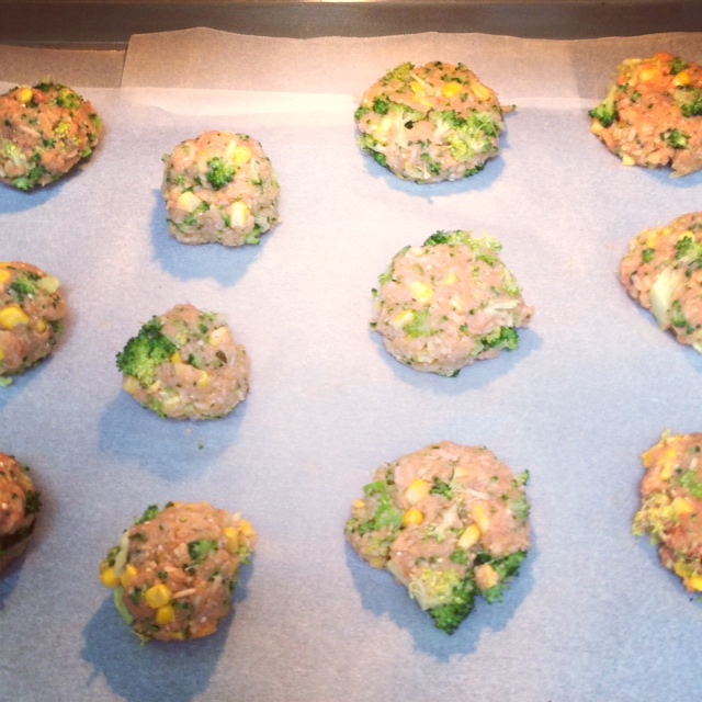 Scoop a dessert spoon of the mixture and roll it in your hand to make a ball and lay it on baking paper on an oven tray for bite sizes. Increase by half for snack size, and if you are making patties, about two spoons full rolled then flattened slightly when you put them on the tray.