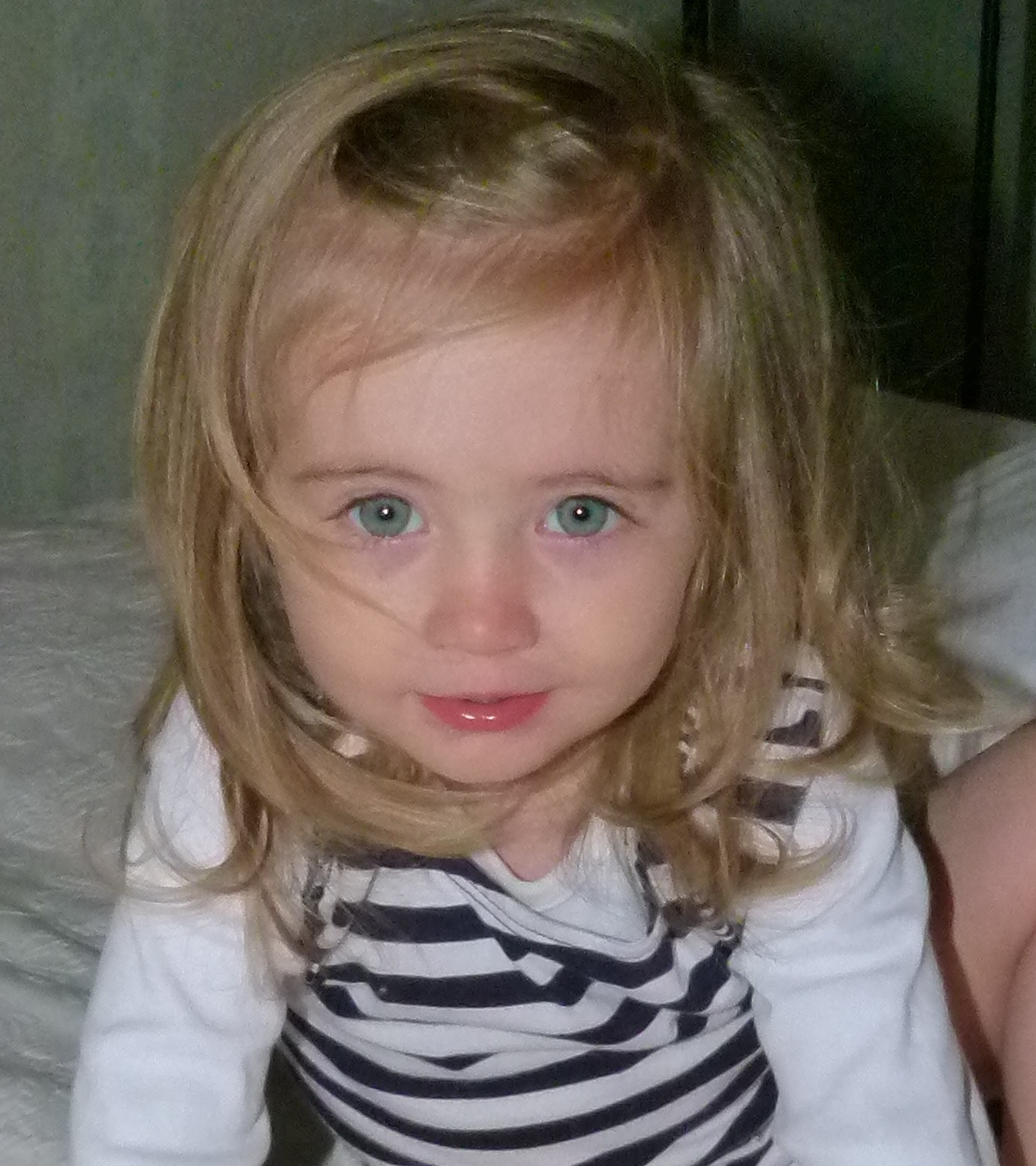 Her eyes, which have been so blue since she was born, seem to have lightened a little. I find myself wondering if they might end up the same colour as my sister and I: blue around the outside and green in the middle?