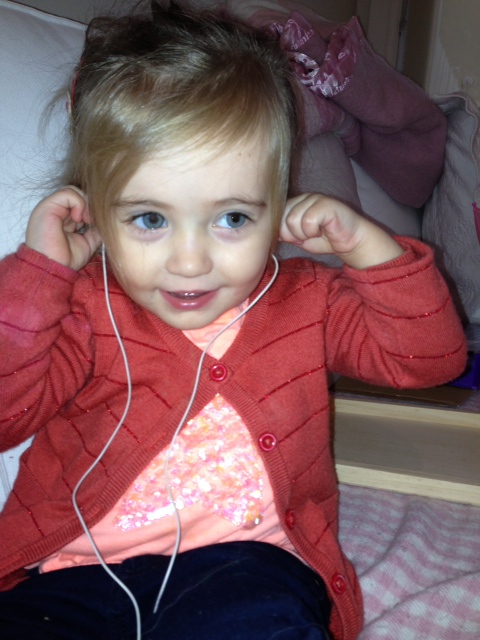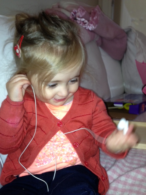 I helped her put one of the ear pieces in then found some music for her to listen to. She’s never listened to music through earphones before.