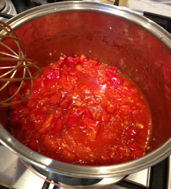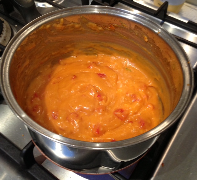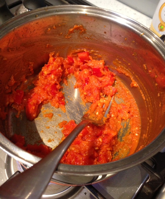 In a medium saucepan, brown some butter {approximately 2 tablespoons} and add in garlic and onion. Stir until onion is translucent then pop in your stock powder, tomato paste and diced capsicum. Simmer, stirring for 3-4 minutes.