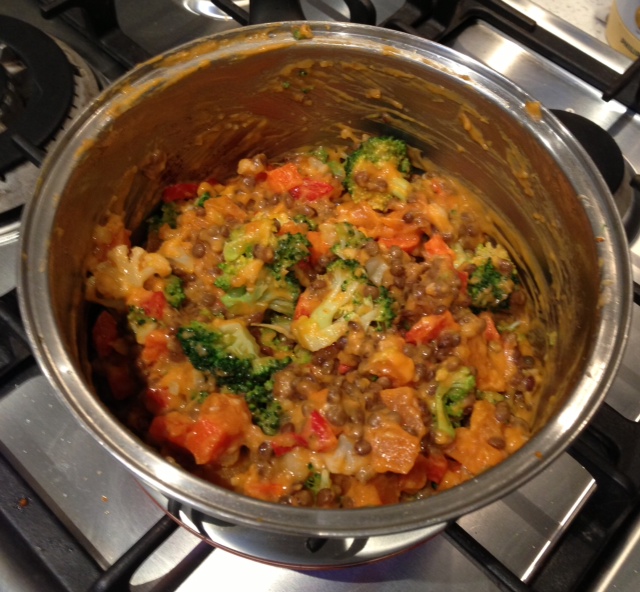 While your pastry is baking, lightly steam your sweet potato, carrot, broccoli and cauliflower. Drain and rinse your lentils. Mix all your vegetables together and put to the side.