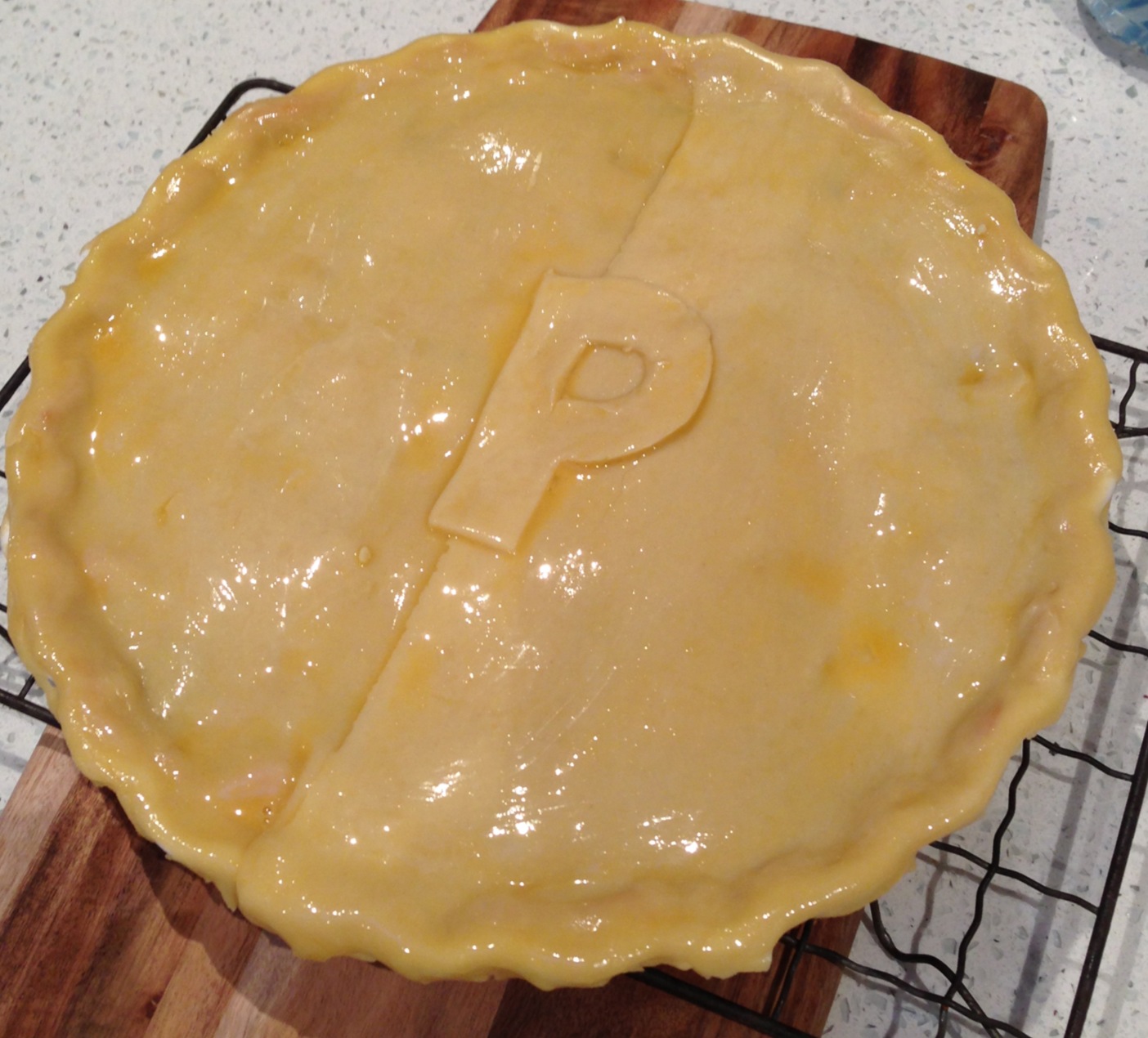 We put a P for pie on top of ours {okay, you know me better than that – it’s a P for Poppy!} … if you’ve got left over pastry and a sous chef, adding something extra to the top is always fun. Next time we might get out our cookie cutters! Don’t forget to egg wash over the top of your decorations too. Don’t forget to prick the top layer of pastry with a fork or skewer – so the steam can escape without cracking your pie case.