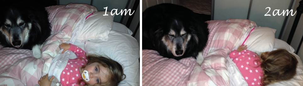 1. Just a bad dream and she didn’t want to go back in her own bed. I spent 5 hours trying to move myself out of the way of her Bend it Like Beckham kicks!!