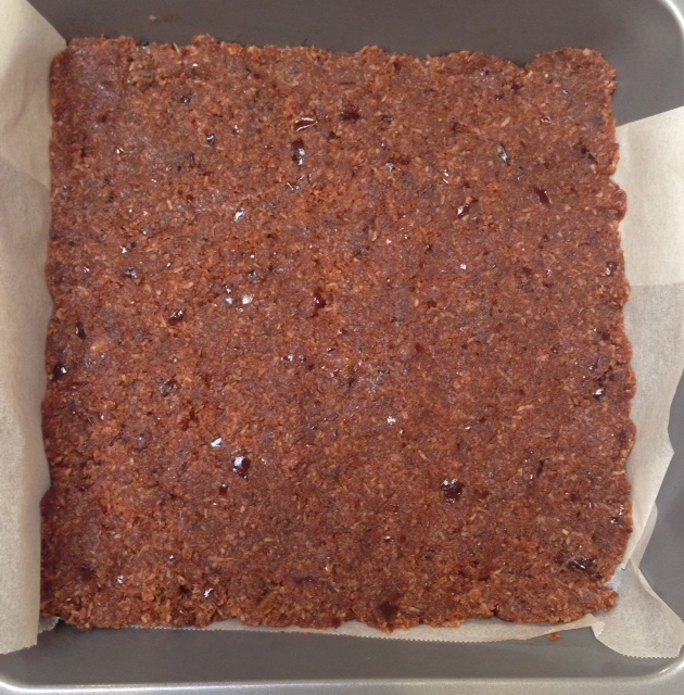 Put it all in a blender or food processor. Press go. It is quite thick and you may need to scrape the sides down a few times to make sure the dates are totally broken down. We had a few chunkier pieces of date in the end, but we’re okay with that. Once combined, press into a slice tin lined with baking paper and pop in the freezer to firm. We took ours out after an hour or so and it was just right.