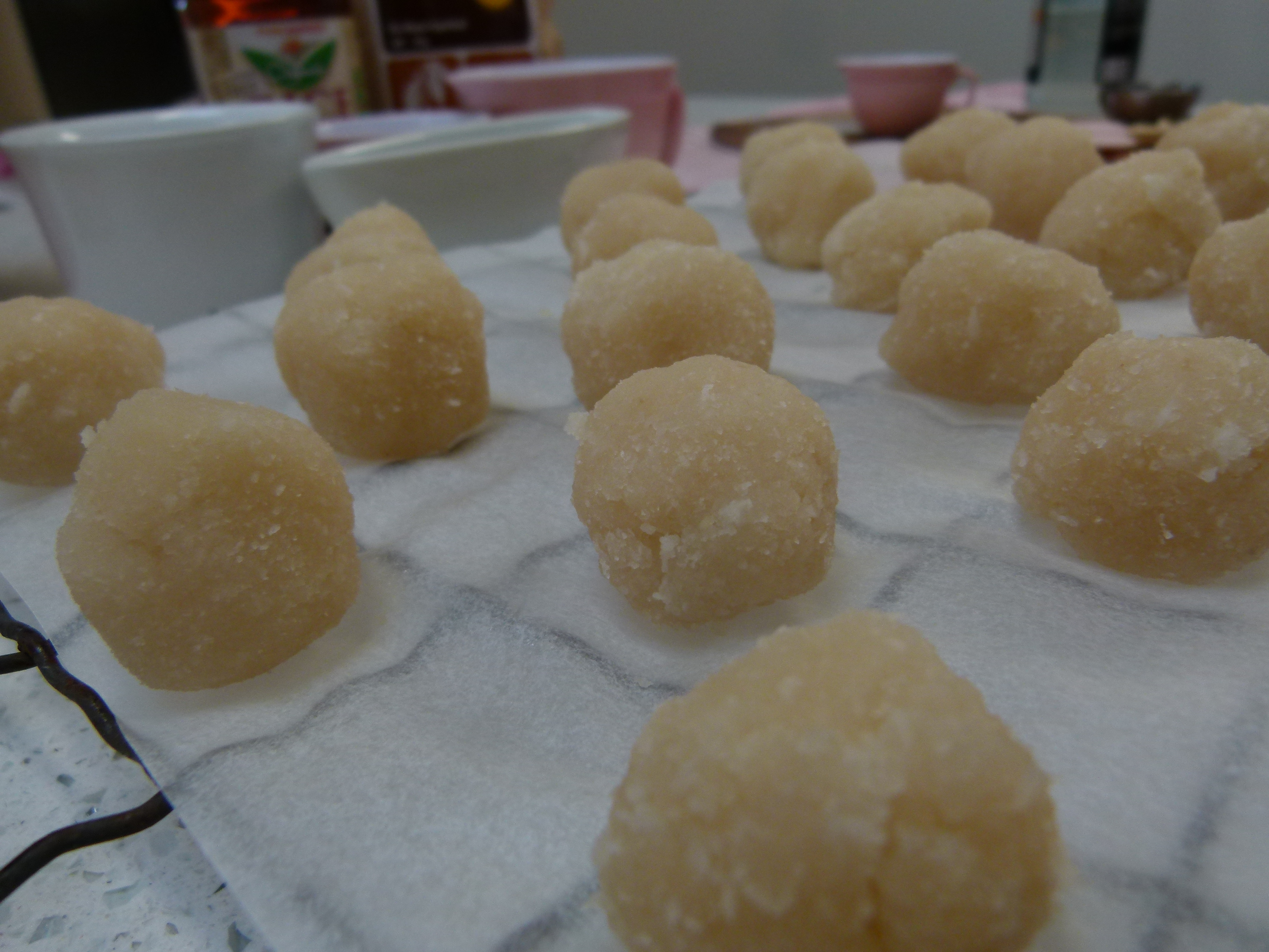 Roll your mixture into small balls. I found myself thinking they are about the same size as a Lindt ball … but that’s probably not the point! And really, they’re actually a little smaller.