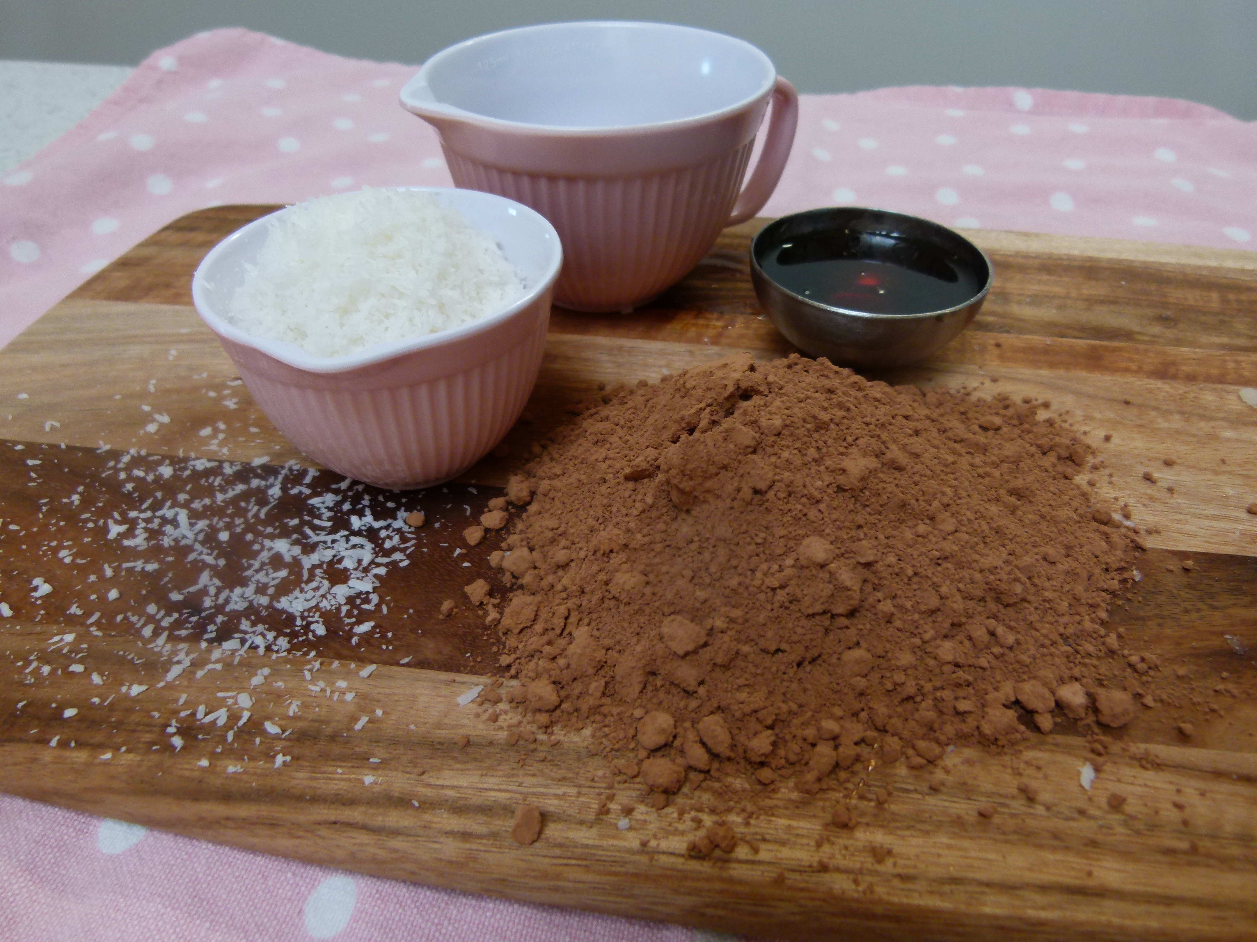 Heat the coconut oil under hot water {or in the microwave} and mix in a bowl with coconut, maple syrup and cacao powder.
