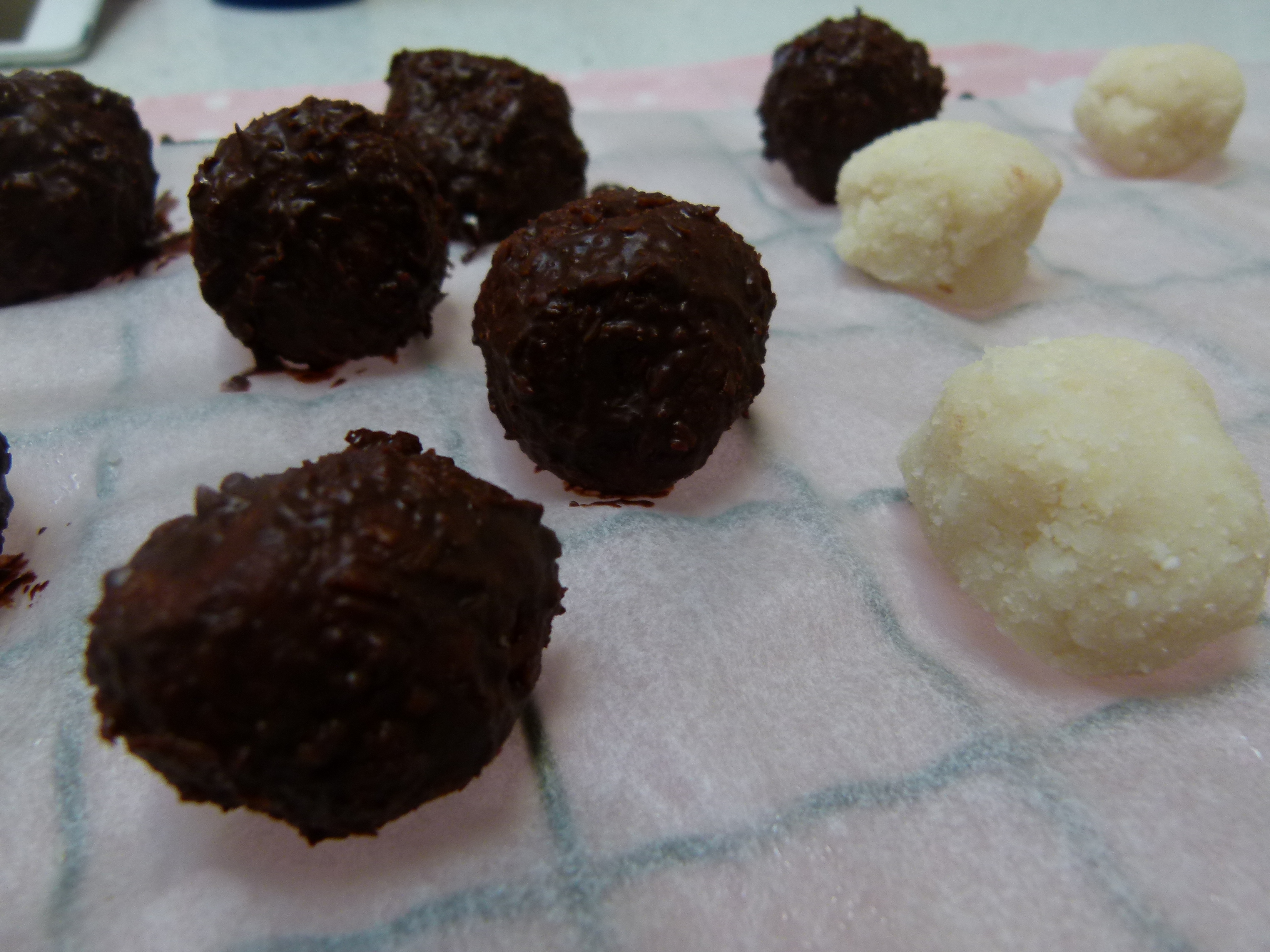 Line a plate, baking tray or anything freezer suitable with baking paper, pop them on it and put them in the freezer to harden up. I took mine out as soon as I was done making the coating and they were fine.