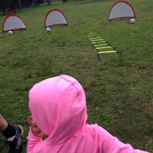 We ran to warm up. Yes, I did say we because, well, Little Miss Shy wanted me to join in the fun. We practised calling our team mates names then throwing and catching the ball. Then we did a drill where we jumped over a metal thing {very technical term for it, don’t you think?}, ran along a rope ladder laying on the grass, then kicked the ball into goal nets. It was fun.