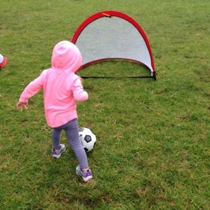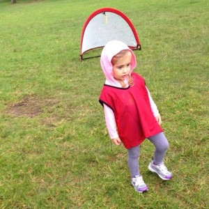 The kids then split into 4 teams {bibs v non bibs} to play a game. Of course this was more a ‘choose your own team and kick whatever ball you’re nearest into whichever net you have your sights set on’ but it was fun to watch them all running around in the rain giggling.