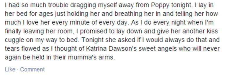 In no way am I diminishing anyone else’s grief or feelings of love and support to Katrina and Tori‘s families. I think it really hit home to me because of the ages of her children. Given the groups on Facebook are mostly mummas with children who are similar ages, I imagine that was what struck a chord with those women too.