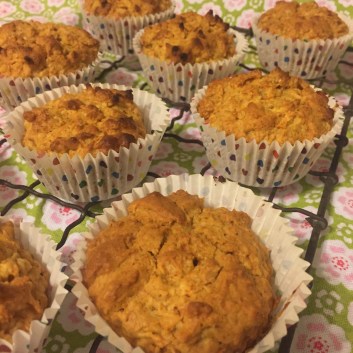 Mix wet ingredients, in separate bowl mix dry. Combine. Bake on 190 15-25 mins until lightly golden on top. Optional topping mix nut paste with some natural yoghurt.