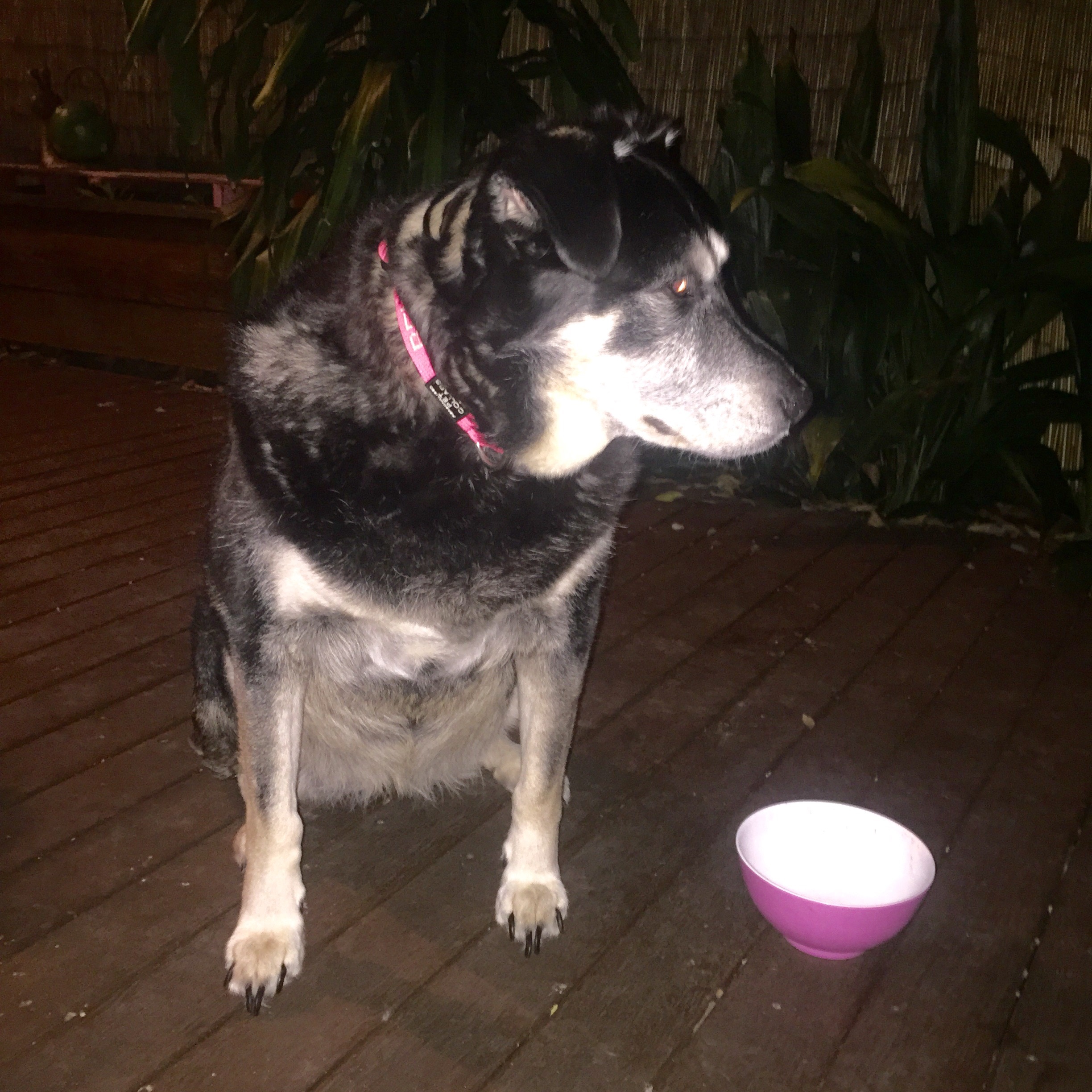 One look out on the back deck solved the mystery: not happy with my suggestion that the dishwasher could do its own job, Bella had absconded with the bowl to clean it in peace!
