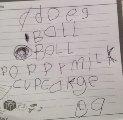 Love Bug isn’t well so she’s spending another day with grandma {lucky Love Bug – I wish it was me spending the day with her!}. My mumma sent me through a photo of Love Bug’s shopping list. Until now, she has generally drawn pictures on shopping lists, and will write her name too.