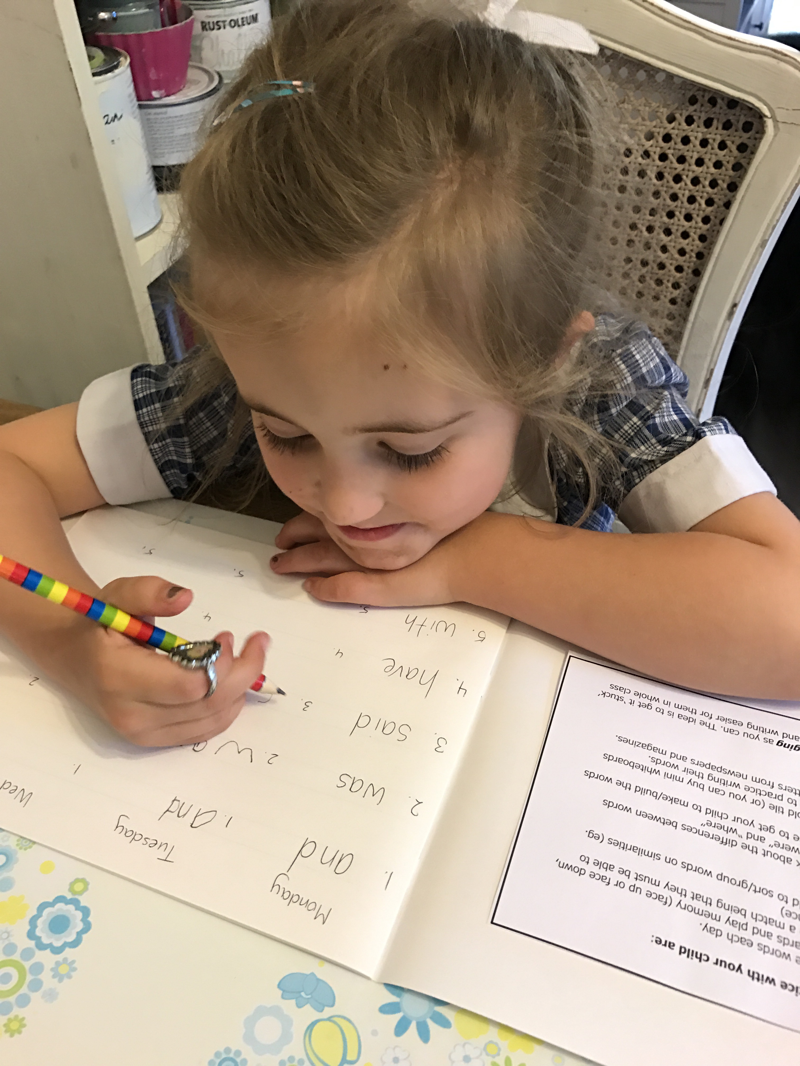 Love Bug had her first written homework last night. To be honest, I’m not really a fan of homework in primary school {I’d rather she was playing after a full day of concentrating at school} but it is too cute a milestone not to share.